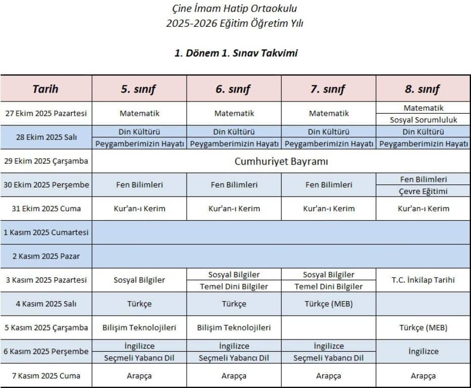 Okulumuzda 2025-2026 eğitim-öğretim yılı 1. yazılı sınavları Millî Eğitim Bakanlığı yönergesi doğrultusunda belirlenmiştir. Öğrencilerimizin sınavlara planlı ve verimli bir şekilde hazırlanabilmeleri amacıyla sınav takvimi hazırlanmış ve sınıflarımızla paylaşılmıştır. Sınav programına öğrencilerimiz okul panolarından ve okulumuzun web sitesinden ulaşabileceklerdir. Velilerimizin de öğrencilerimizin hazırlık sürecini takip edebilmeleri için sınav takvimini incelemeleri önem arz etmektedir. Tüm öğrencilerimize sınavlarda başarılar diler, düzenli çalışma alışkanlığı edinmelerini temenni ederiz. NOT: Sınav programında herhangi bir değişiklik olması durumunda gerekli bilgilendirme yapılacaktır.